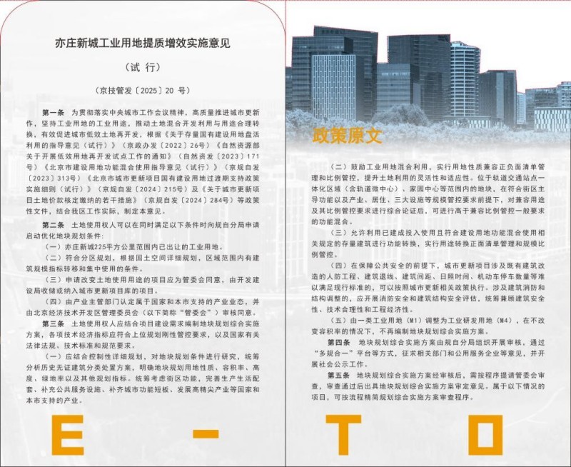 近日,北京经开区正式印发《亦庄新城工业用地提质增效实施意见(试行)》,并同步发布《亦庄新城工业用地提质增效案例手册》,推出以“创新政策+案例手册”为核心载体的服务新模式。其相关经验作为北京唯一案例入选自然资源部《支持新产业新业态发展的规划和土地政策创新案例集(第一批)》并向全国推广。同时在北京经开区2026年高质量发展大会上被收录至《经开区惠企政策清单和政策兑现月历》,为区域发展从“增量扩张”向“存量提质增效”的深刻转型提供了靶向精准、闭环衔接的有效解决方案,进一步推动北京经开区营商环境实现系统性优化升级。