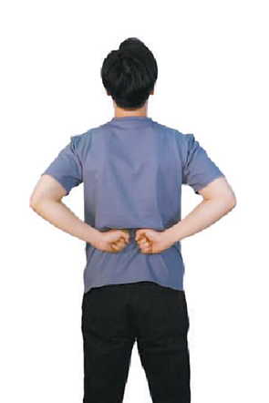 身体站立,双手握拳,用食指掌指关节,抵住手能够到的腰椎最上段;吸气时食指掌指关节向腹部方向垂直按压,感觉酸胀后,保持掌指关节不离开体表;按压的同时腰部挺起,边按推边挺腰,从上到下一直按到骶骨为止。此动作重复3遍。