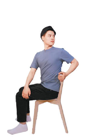 身体正坐,以左侧为例,左手扶握左侧椅背上方,右手扶住左腿外侧固定,向左侧转腰至最大限度,停10秒。此动作左右交替转动10次。