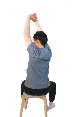 身体正坐,双手十指交叉,吸气时掌心朝上,向上托举至头顶,随着托举动作,身体向上拉伸,到极限后停1秒钟;呼气时身体倒向一侧,到极限后停1秒钟;吸气时还原正坐位。此动作左右交替拉抻5次。