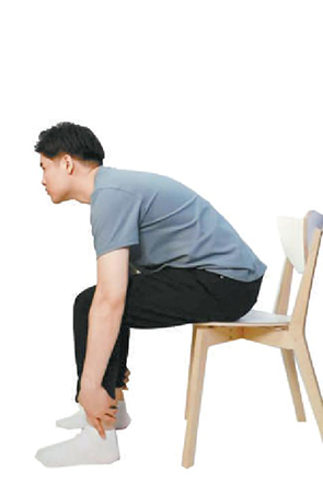 身体正坐,向前弯腰,前胸尽量贴到大腿,双手向下抓住两踝关节,到最大限度停5-10秒钟。此动作连续做10次。