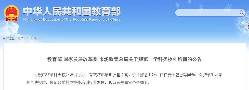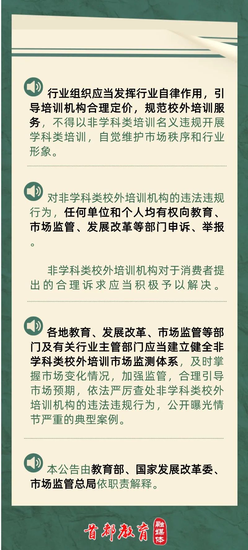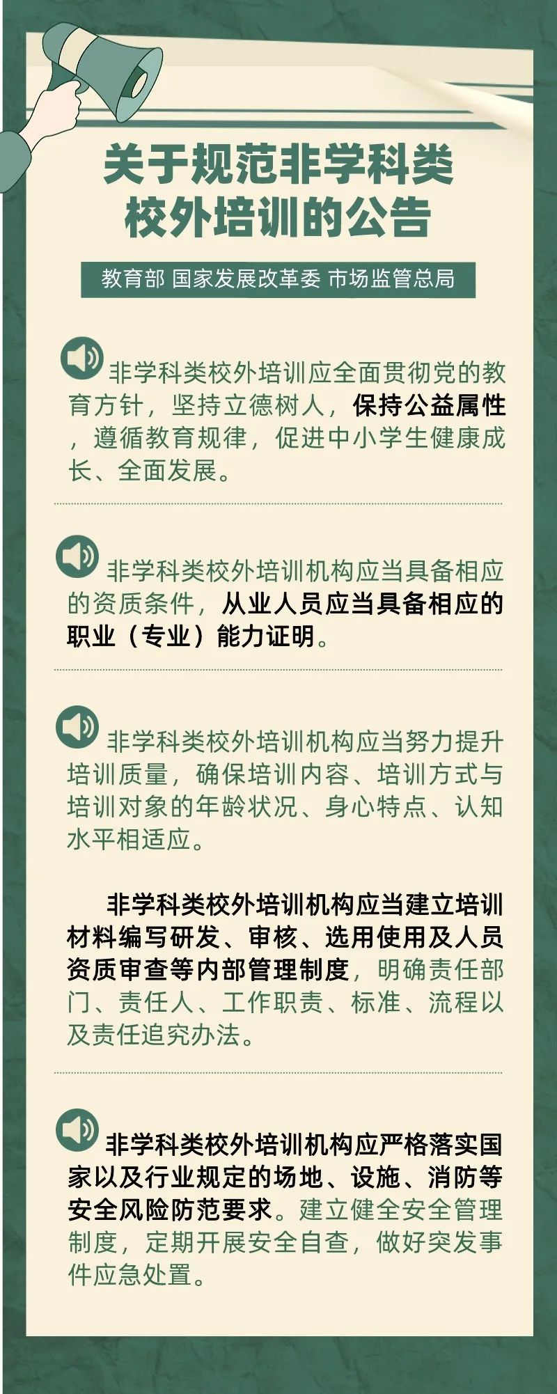 近日,教育部、国家发改委、市场监管总局等三部门发布关于规范非学科类校外培训的公告,要求: