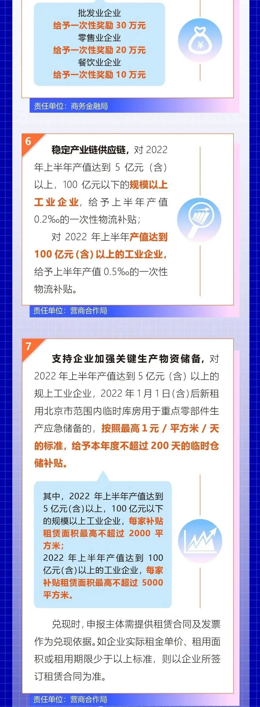 稳定产业链供应链是北京经开区企业共同的心声。为此,《措施》在物流、仓储等方面给予了强有力支撑。对规上工业企业,根据企业上半年产值情况给予0.2‰~0.5‰的一次性物流补贴;对今年新租用北京市范围内临时库房用于零部件生产应急储备的规上工业企业,按照最高1元/平方米/天的标准给予临时仓储补贴,最多补贴200天。