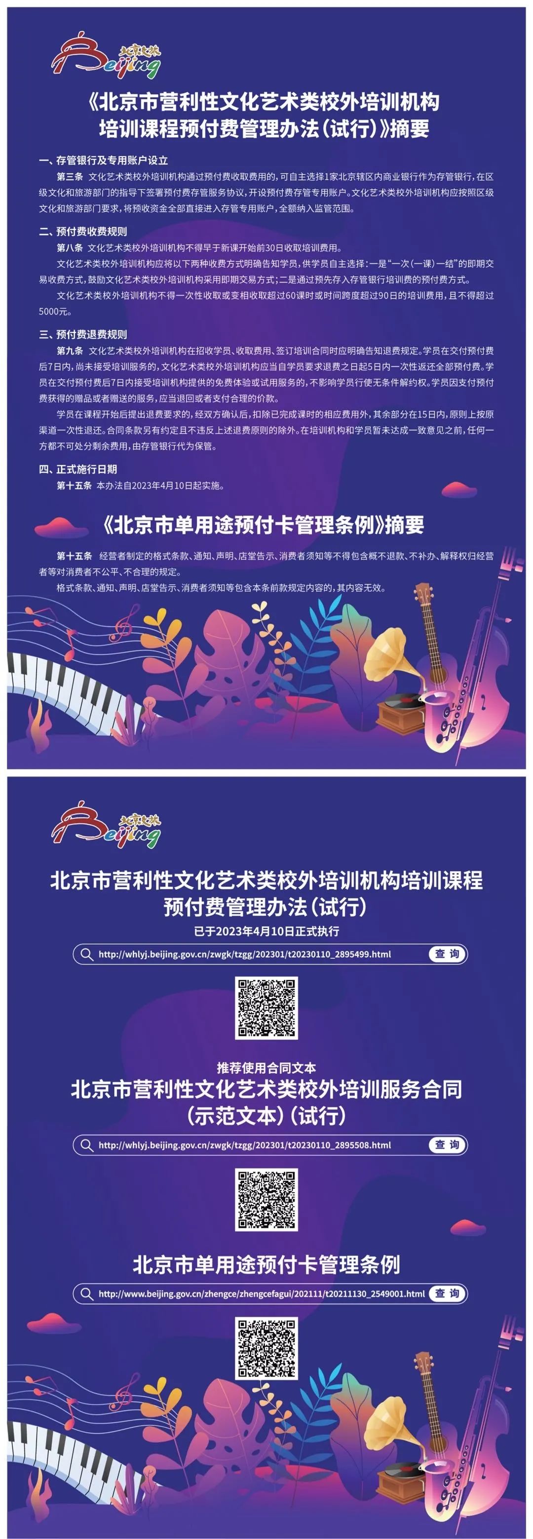 为了进一步保护学员权益,《管理办法》规定,文化艺术类校外培训机构提供培训服务,应参照《北京市营利性文化艺术类校外培训服务合同》(示范文本),与学员(包括未成年学员监护人或成年人学员)签订书面合同文本,并按照合同约定及相关规定办理收费和退费事宜。对涉及学员义务或文化艺术类校外培训机构权利的内容,文化艺术类校外培训机构应当以显著方式进行提示,且不得早于新课开始前30日收取培训费用,以及指定或强制学员使用预付费方式。