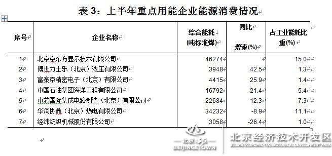 19家重点耗能企业中,新增企业京东方显示技术有限公司占规上工业能耗的比重达到15%,对规上工业能耗的增长拉动作用最大。其中10家企业能耗同比增长,4家企业的增幅超过10%,博世力士乐(北京)液压有限公司能耗增速最高,同比增长42.5%,主要原因是本年天然气、润滑油等辅助生产用能增长较快;8家重点用能企业能耗同比下降,其中经纬纺织机械股份有限公司受产能下降影响,能耗下降最快,同比下降26.4%。