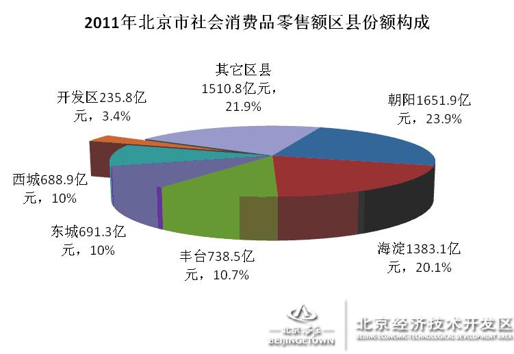 4.社会消费品零售额保持较快增长。2011年,开发区社会消费品零售额235.8亿元,同比增长19.7%,占全市的3.4%,比上年提高0.2个百分点。在全市各区县中,开发区社会消费品零售额总量排第六位,增速排第一位。总量排名前五位的分别是朝阳区、海淀区、丰台区、东城区、西城区。