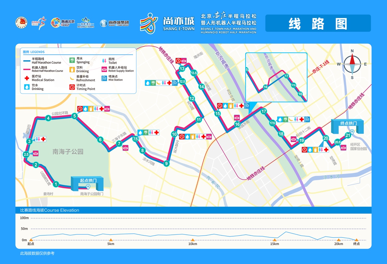 经北京经济技术开发区管理委员会批准,2025北京亦庄半程马拉松暨人形机器人半程马拉松定于4月19日(星期六)在北京经开区举行,起点设在南海子公园南门,终点设在国家信创园。