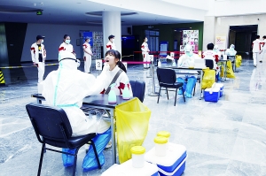 “来,坐这儿,叔叔给你做个检测,怕不怕?”“不怕!”5月27日,这样的对话出现在人大附中经开区学校,现场正在进行的是学生集中核酸检测。只见区内检测企业工作人员身着防护服,一边准备检测用具,一边用轻柔的语气和学生们交谈,减轻孩子的心理压力。