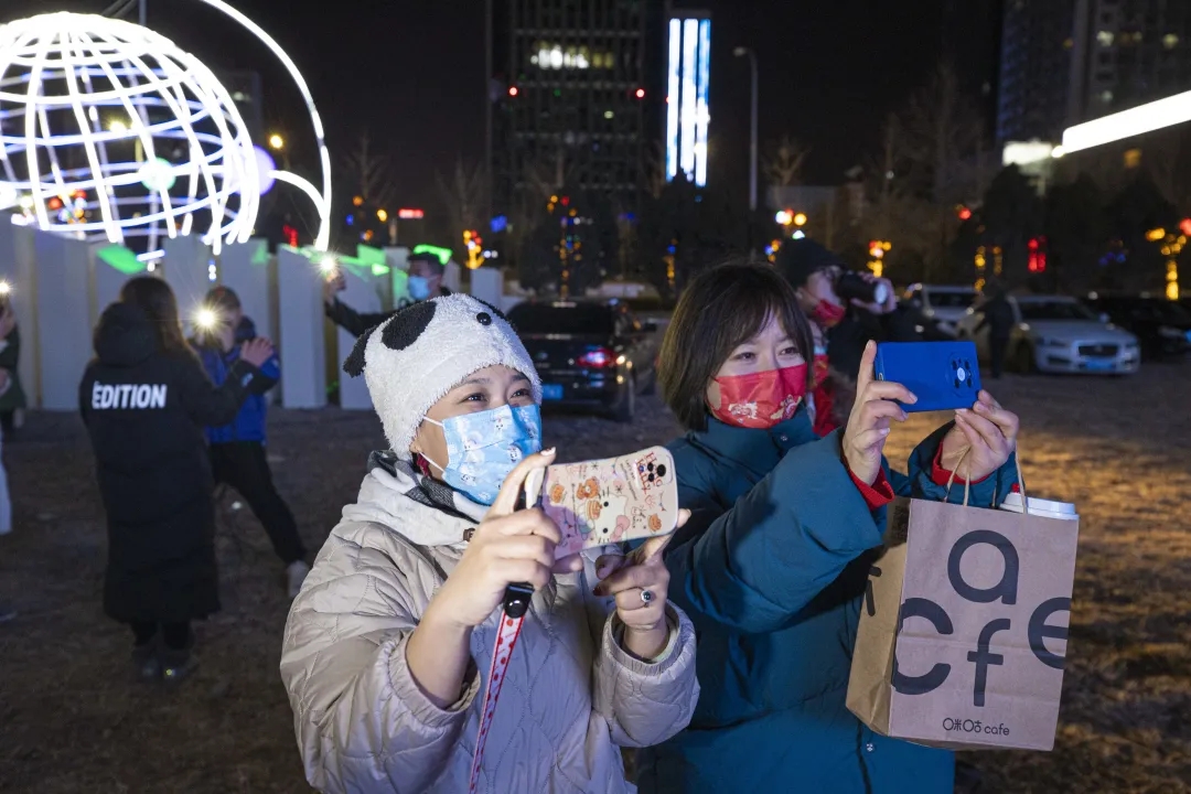20:00,北京冬奥会正式开幕,媒体一行来到了第二个目的地——北京经开区大族广场。此时大族广场的5G+8K超高清大屏前,已经聚集了不少群众居民,他们有的正对大屏观看效果赞不绝口,有的则是举起手机向朋友描述着自己独特的开幕式观看方式……