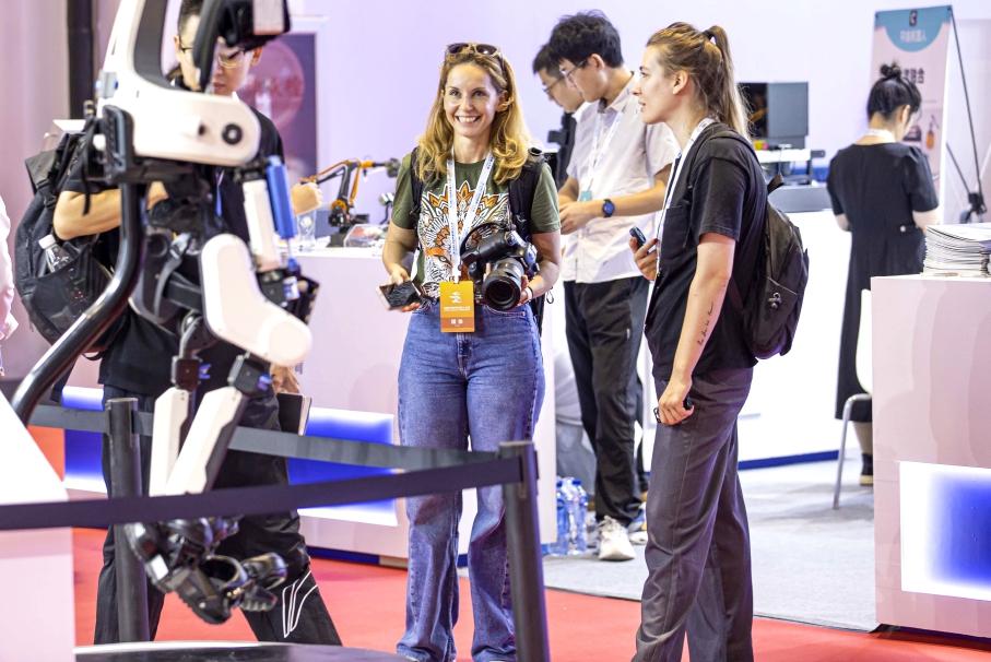 8月16日下午,2023世界机器人大会在北京经开区亦创国际会展中心开幕,本届大会包括论坛、世界机器人博览会和世界机器人大赛等活动。其中,世界机器人博览会吸引了159家国内外机器人企业携近600件展品参展,其中60款新品在博览会现场全球首发。博览会还打造“机器人+”制造业、农业、商贸物流、医疗健康、商业社区服务等10个应用场景展区和1个关键零部件展区,多维度呈现机器人行业新技术、新产品、新方案和新应用。图为外籍记者被现场机器人吸引驻足。融媒体中心张磊/摄