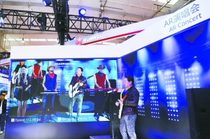 一名参观者站在华为展台上,旁边的显示屏上却显示一支外国乐队正在调试乐器。在这支外国乐队的远程伴奏下,他高歌一曲。这是通过华为5G视频采集技术进行的一场“5G全球异地同台演出”。