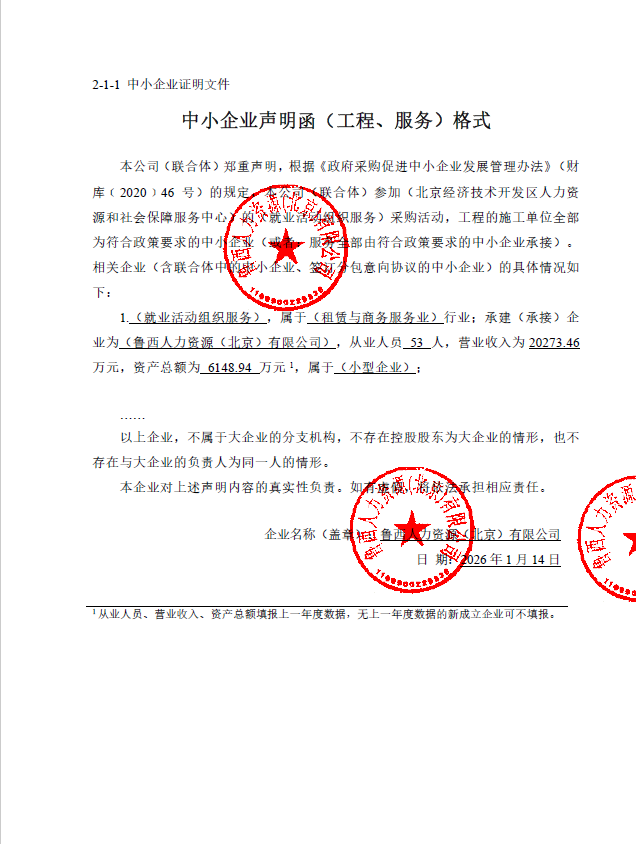 鲁西人力资源(北京)有限公司 | 就业活动组织服务 | 无 | 1 | 155.8万元 | 155.8万元 | 详见附件招标文件 |