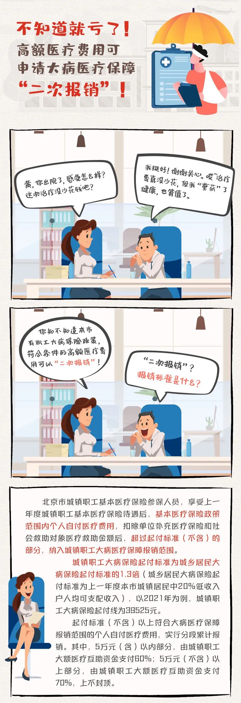 为进一步完善北京市城镇职工医疗保险制度,提高重特大疾病保障水平,减轻大病患者高额医疗费用负担,北京市医疗保障局、北京市财政局联合印发《关于进一步加强城镇职工大病医疗保障的通知》(京医保发〔2020〕20号),自2020年1月1日起执行,建立城镇职工大病医疗保障机制。“二次报销”的标准是什么?是否需要个人申请?多久报销一次?这就给你解答!