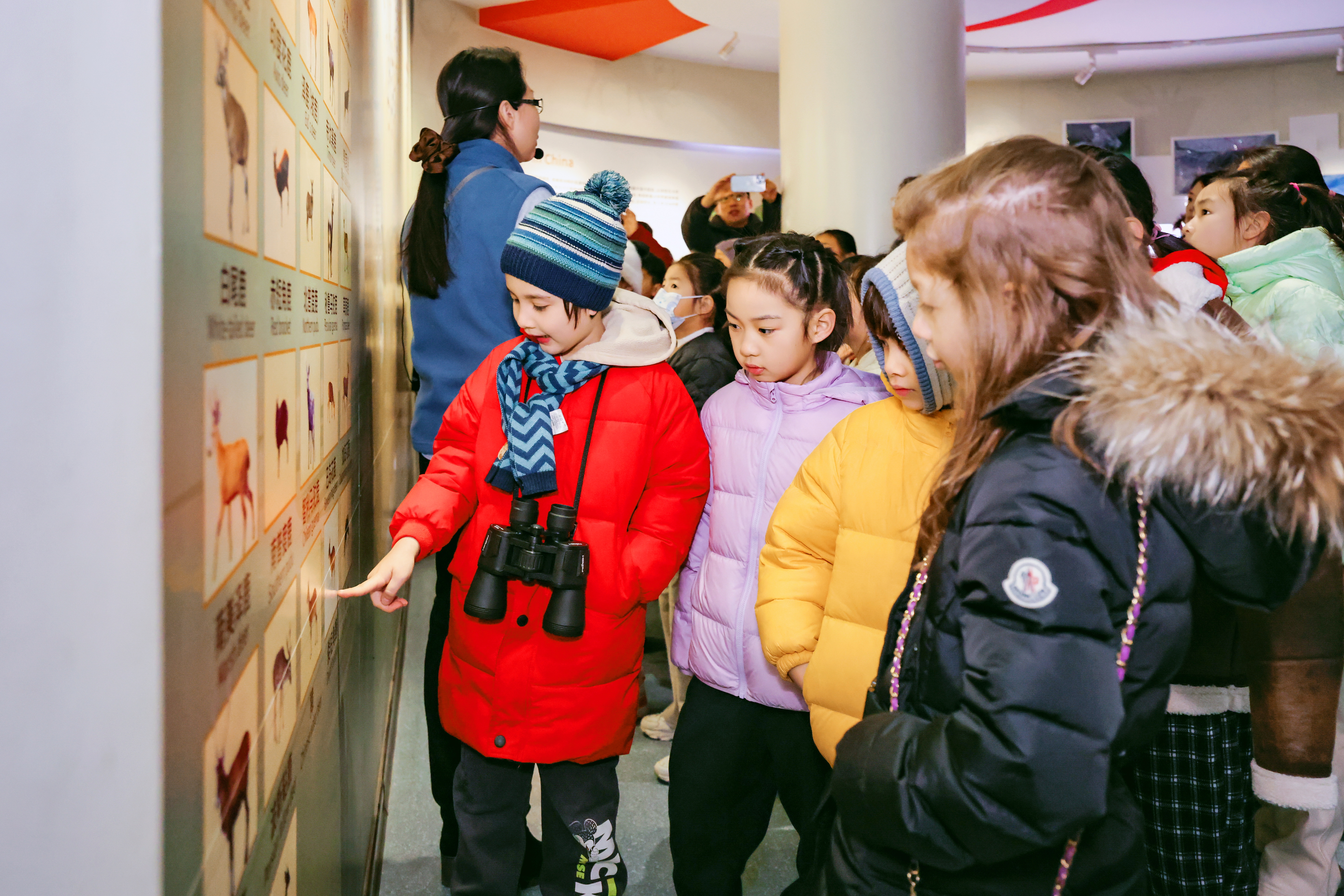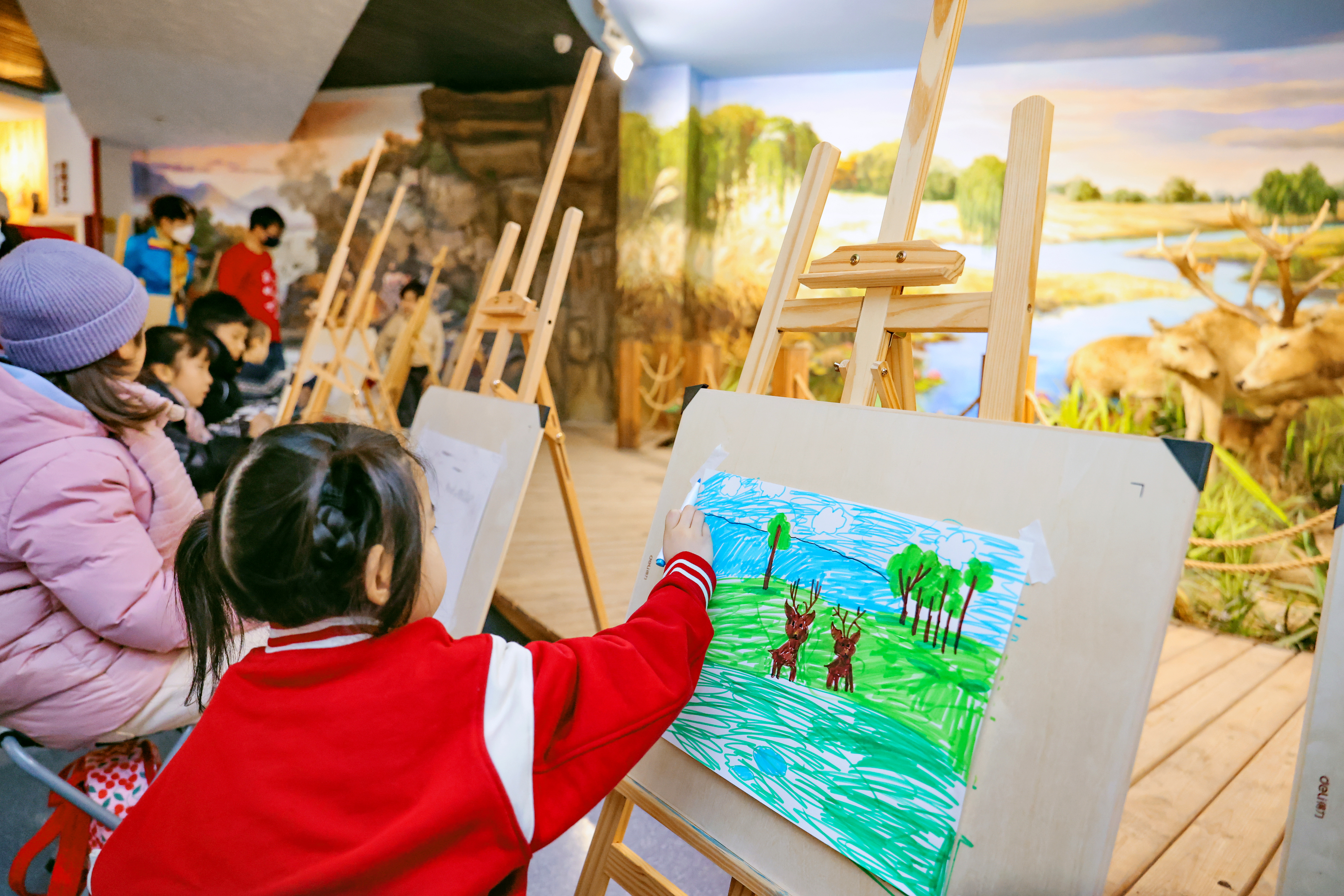 北京麋鹿生态实验中心展览部部长胡冀宁带领小朋友们一起走进麋鹿传奇展,一幅麋鹿与梅花鹿、老虎、亚洲象等动物共同生活在华夏大地上的画作映入眼帘,绿意盎然的场景勾勒出一派繁荣的生态景象。