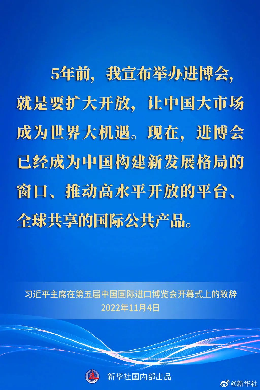 习近平指出,5年前,我宣布举办进博会,就是要扩大开放,让中国大市场成为世界大机遇。现在,进博会已经成为中国构建新发展格局的窗口、推动高水平开放的平台、全球共享的国际公共产品。