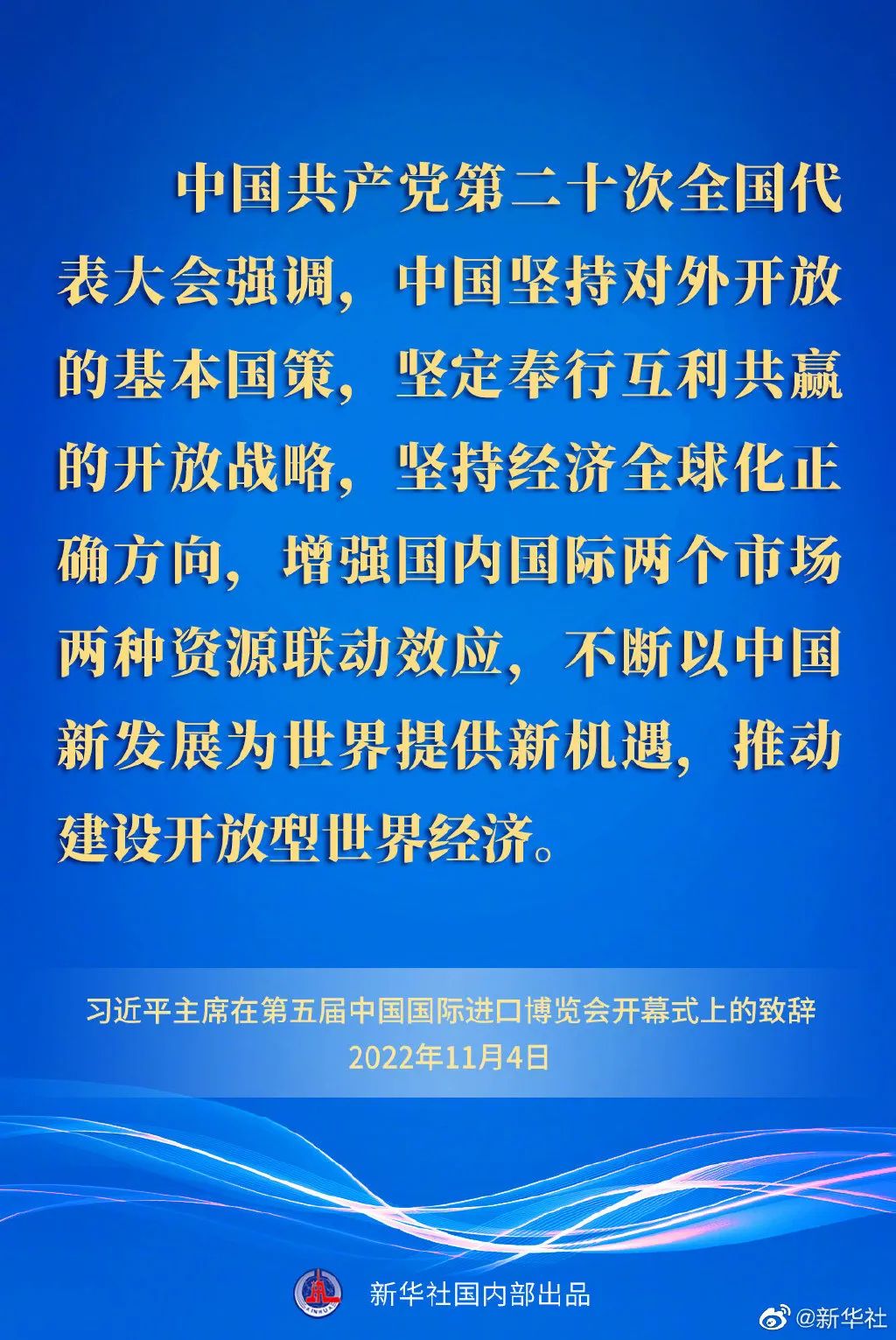 习近平指出,中国共产党第二十次全国代表大会强调,中国坚持对外开放的基本国策,坚定奉行互利共赢的开放战略,坚持经济全球化正确方向,增强国内国际两个市场两种资源联动效应,不断以中国新发展为世界提供新机遇,推动建设开放型世界经济。