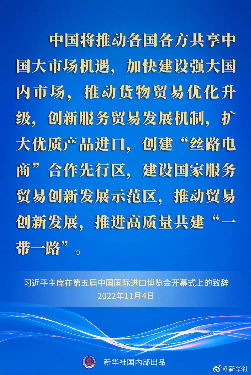 ——中国将推动各国各方共享中国大市场机遇,加快建设强大国内市场,推动货物贸易优化升级,创新服务贸易发展机制,扩大优质产品进口,创建“丝路电商”合作先行区,建设国家服务贸易创新发展示范区,推动贸易创新发展,推进高质量共建“一带一路”。