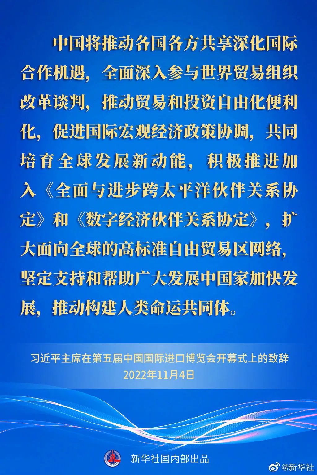 ——中国将推动各国各方共享深化国际合作机遇,全面深入参与世界贸易组织改革谈判,推动贸易和投资自由化便利化,促进国际宏观经济政策协调,共同培育全球发展新动能,积极推进加入《全面与进步跨太平洋伙伴关系协定》和《数字经济伙伴关系协定》,扩大面向全球的高标准自由贸易区网络,坚定支持和帮助广大发展中国家加快发展,推动构建人类命运共同体。