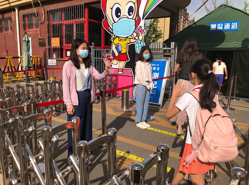 △北京亦庄实验小学门口,老师们站在门口迎接同学们的到来。