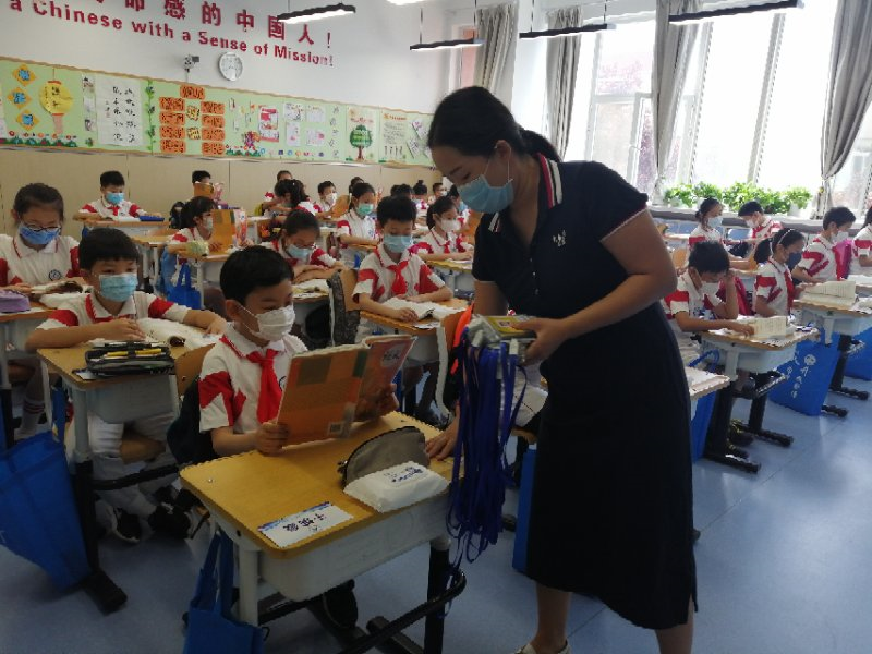 △人大附中经开区学校,老师为同学们发放入校出入证。