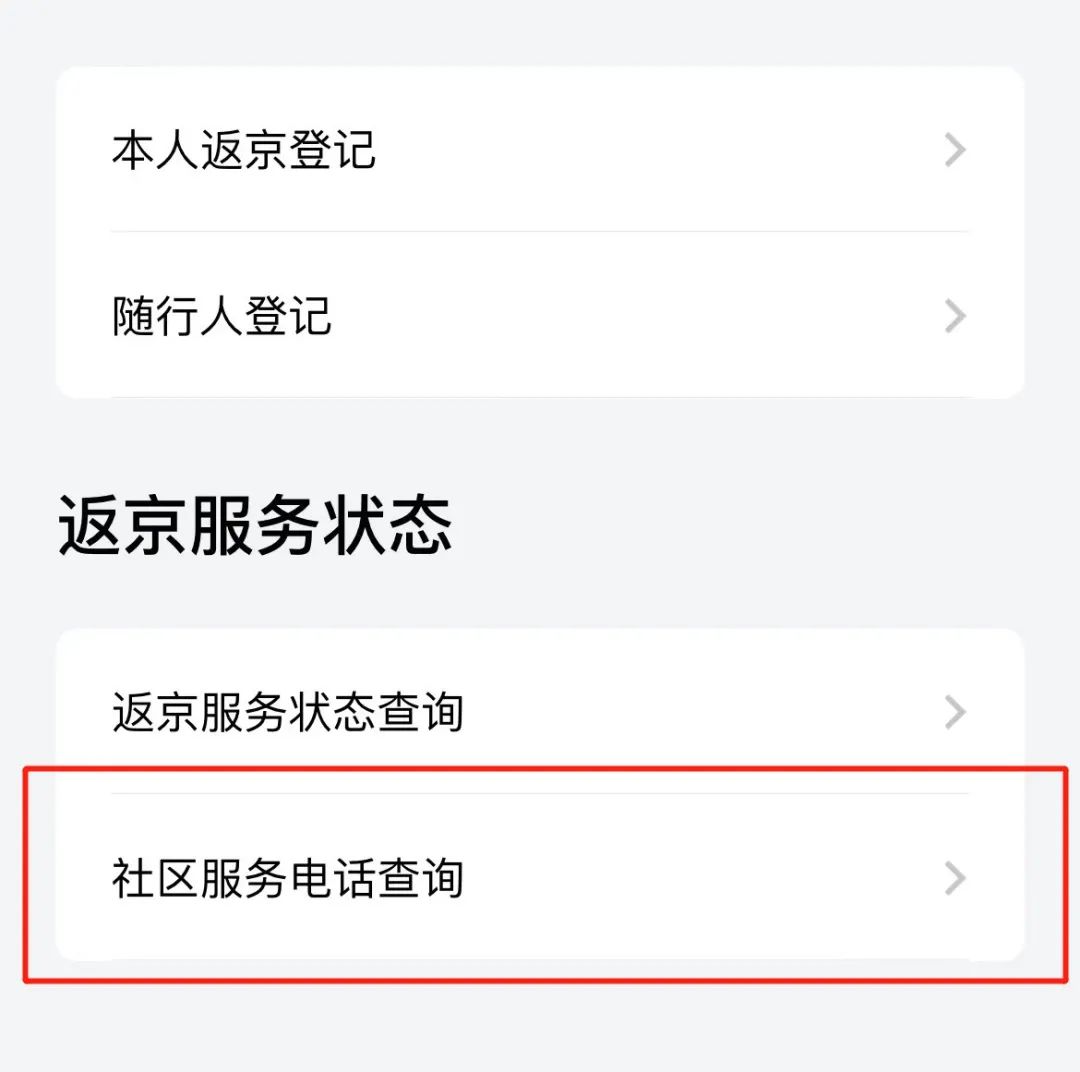 点击【返京服务】板块中的【社区服务电话查询】选择你所在的区及街道、社区即可查询社区服务电话。