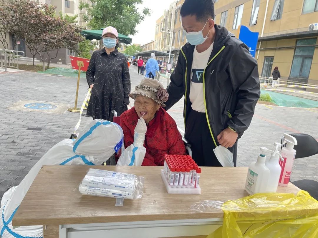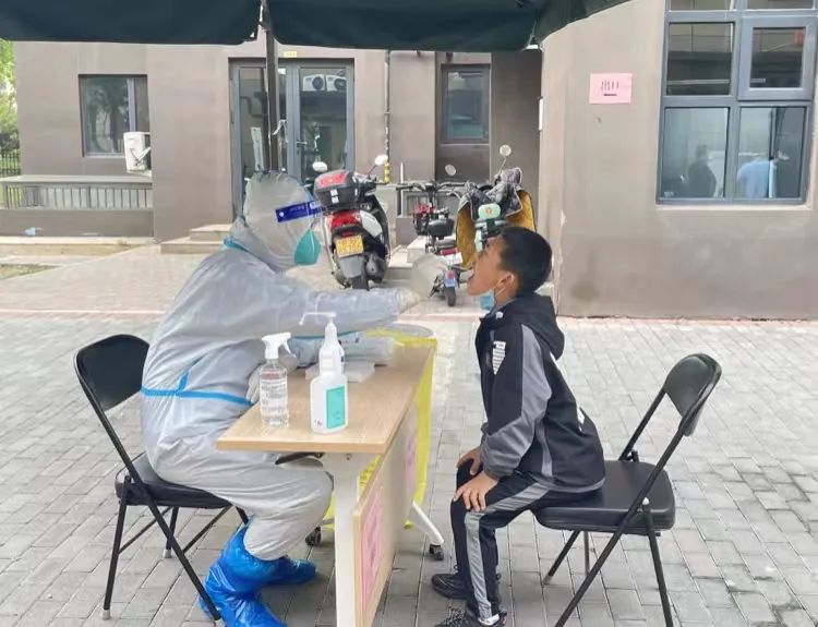5月22日下午两点半,阳光正强,在亦城景园社区8号楼1单元楼外采样台等待核酸检测的居民们感觉到凉意十足。住在8号楼的56岁居民王武全,睡醒午觉后下楼走了两三分钟,便来到“绿色通道”做核酸检测。该检测台设置在亦城景园社区服务站对面,在树荫里排队、登记信息、采样,五分钟时间,王武全便完成了整个核酸检测流程。