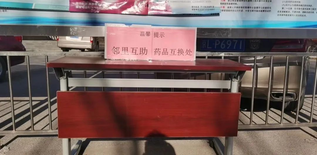 为啥要设“邻里互助药品互换处”?原来这段时间小区各楼群、业主群里不乏居民们互助共享各类药品、防疫物资的对话,街道、社区、物业工作人员感动之余,也琢磨着如何让这份互助爱心更高效、无障碍,为更多有需要的人送去帮助。“要不咱们设一个互换点给大家搭个平台!”晚上,工作交流群的一句提议为大家提供了好点子。有了想法立即付诸行动,第二天上午,小区物业搬来桌子,又从办公室就地取材腾出两个纸箱,用粉纸包裹装饰后,在小区东门设起“邻里互助药品互换处”。“这口儿大伙儿平时出入多,谁家想过来送药、取药都方便!”冯军辉和同事们边商量边忙活着。