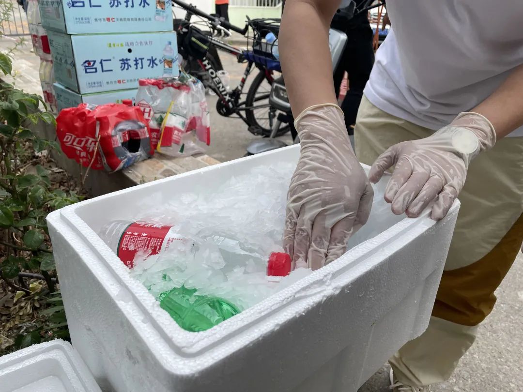 下午两点,持续的高温和炙烤几乎将工作人员的汗水都蒸发掉了。“水和冰块来了!”附近超市负责人马峥和同事们的准时出现,让工作人员们感受到了一丝难得的清凉。据了解,为了给社区的工作人员降温解暑,该店持续为该社区两处检测点的工作人员每日准时运送瓶装水和冰块。