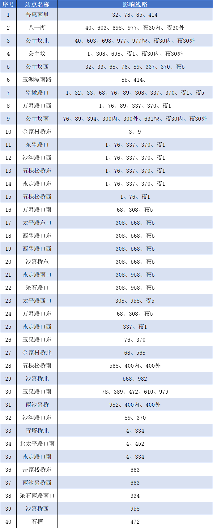 1号线八通线:公主坟站(A口、D口)、万寿路站(C1口、C2口、D1口、D2口)、五棵松站(C1口、C2口、D1口、D2口)、玉泉路站(C1口、C2口、D1口、D2口)以上车站涉及的出入口采取封闭措施,乘客可从上述车站其它出入口进出。