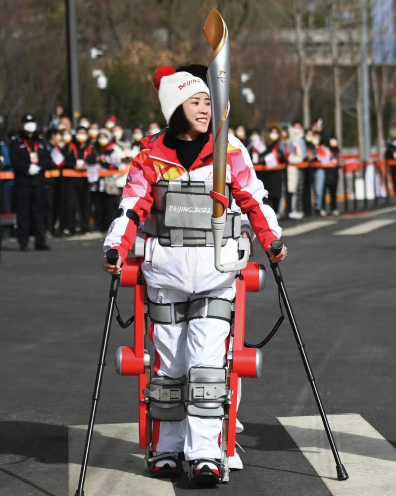 截瘫患者借助外骨骼机器人完成火炬传递。