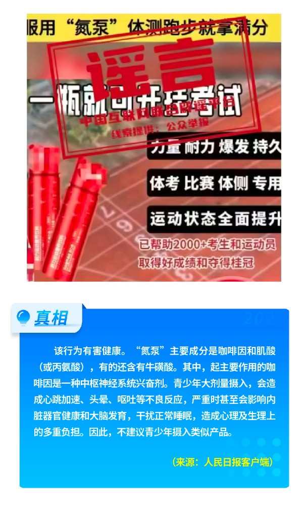 教育、文旅等领域谣言扰乱视听。部分账号假冒官方发布,在中考、公共假期等时点散布虚假信息。如“江西南昌2025年中考取消选择题和填空题”谣言,打着“教育部官宣”的旗号,引发家长群体过度担忧;另有部分商家瞄准社会公众对升学备考的关心,声称“中考体测使用‘氮泵’可提升成绩”“用体考神器考试开挂”,诱导家长购买对青少年身体可能造成伤害的产品。五一假期期间,有自媒体为蹭热点、涨流量,散布“广西漓江断流,游客徒步江底”谣言,实为对往年枯水期画面的恶意剪辑;“五一登顶泰山得3万奖金”“成都6月1日起公路停车位全面免费”等不实信息,误导广大游客,扰乱社会秩序。更有甚者,编造“5·12北川地震遗址收费”等虚假信息,引发公众议论和忧虑。5·12汶川特大地震纪念馆等机构快速回应、澄清谣言,出示免费政策文件,有效回应了网民关切。