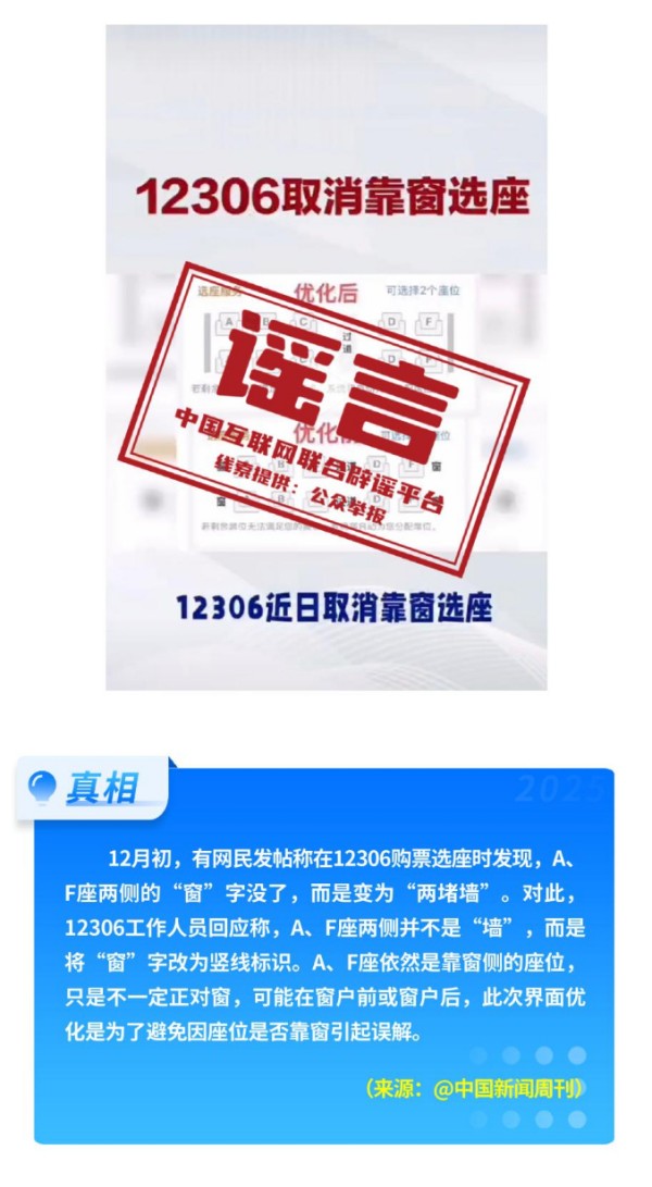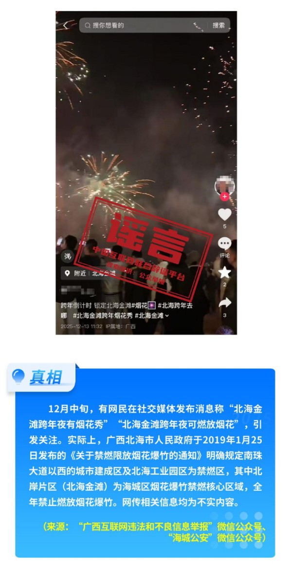 公共政策领域不实信息误导公众。2026年1月1日正式施行新修订的《中华人民共和国治安管理处罚法》,网上出现“明年起向好友发送不雅照片、视频违法”等误读;“一次性信用修复”政策有着严格的适用边界,绝非“征信洗白”;火车高铁“靠窗选座取消”实为12306购票界面优化调整;“海南自由贸易港封关等于‘封岛’”是对海南自由贸易港建设的整体性误解。