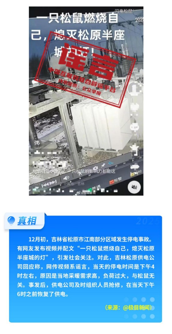 灾害事故类谣言引发恐慌。部分网络账号虚构或夸大险情,以博取流量。“四川绵阳发生山体火灾烧毁30亩林地”引起社会不安;“一只松鼠导致吉林松原‘半城’停电”实为当地采暖高负荷引发短时故障后的“恶搞”;山东潍坊、山西忻州、新疆阿合奇县、四川彭州等地地震不实信息则引发当地民众恐慌。