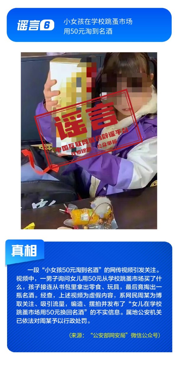 社会民生领域谣言引发不当炒作。“小女孩在学校跳蚤市场用50元淘到名酒”的视频,实为摆拍炒作,虚构“捡漏”情节博取流量;“某奶茶品牌疑似擦边毒品”蹭炒网上热点,似是而非、夸大其辞的说法对企业合法经营造成困扰,也引发公众不必要的焦虑;“微信好友数量过多会被封号”系对平台运营机制的无端猜测,利用网民对平台规则的陌生进行炒作,还可能给黑灰产带来可乘之机。