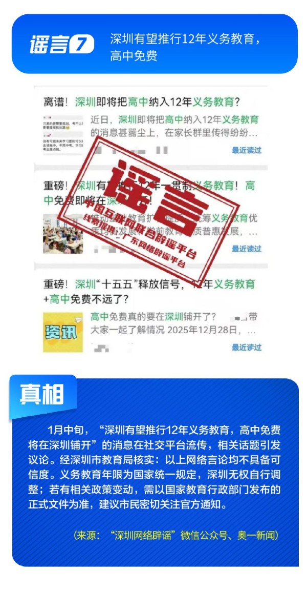 公共政策领域谣言误导公众决策。“社保卡没有有效期限制、未到期不能换新卡”是对社保卡管理政策的误读,给民众平添困扰;“28家博物馆元旦期间闭馆”实为少数博物馆根据运营安排所做的微调,网帖严重夸大实际闭馆情况,引发负面炒作;“深圳有望推行12年义务教育,高中免费”是对现行政策的“超前编造”,误导学生及家长群体;“全国12315平台发布退费公告”,则是假冒监管机构名义散播不实通知,为后续诈骗行为做铺垫。