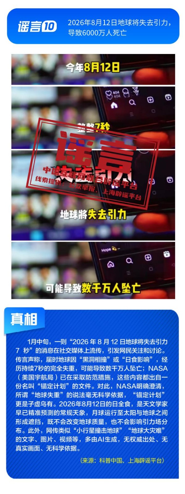 健康与科普领域谣言违背客观规律。“人血白蛋白是‘增加免疫力’的法宝”刻意夸大该处方药的临床用途,忽略其特定医疗场景与使用风险;所谓“大棚草莓、冷库葡萄、进口车厘子、染色砂糖橘是冬天水果界四大毒王”谣言片面解读农产品种植与保鲜方式,缺乏科学依据;“四川两只雄性大熊猫首次成功自然交配”纯属为吸引流量而捏造的猎奇内容,其视频画面为AI生成;“2026年8月12日地球将失去引力,导致6000万人死亡”更是无中生有的荒谬谣言。