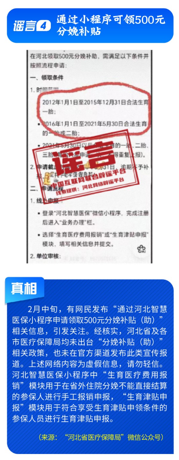 编造民生保障类谣言扰乱民心。网传“2026年春运绿皮车严重超员”视频,相关内容系拼凑历史画面,利用AI生成;“春节快递停运”系谣言,多家快递企业春节正常营运,保障居民寄递需求;“通过小程序可领500元分娩补贴”并非官方正规补贴政策,而是不法分子设置的虚假引流骗局;“个人账户余额用完,不能享受医保待遇”则是对医保统筹保障政策的错误解读,网民切勿因误信谣言而延误正常就医报销。