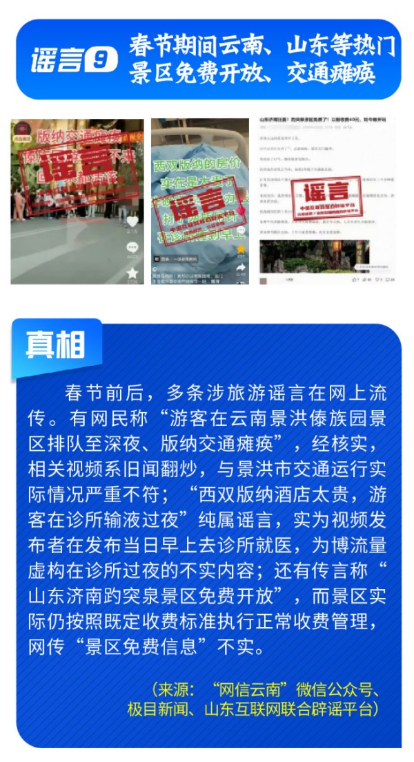 虚构经济文旅类信息混淆视听。经济、文旅领域谣言蹭炒热点、歪曲事实,“天津滨海新区2025年GDP增速仅为0.6%”与官方发布数据不符,谣言篡改经济数据,否定区域经济发展实绩;“云南景洪傣族园景区交通瘫痪”“西双版纳酒店太贵遂去诊所输液过夜” 等信息,或夸大交通拥堵状况、或杜撰虚假经历,只为蹭炒节日流量;“山东济南趵突泉景区免费”“过年重庆轨道交通跑熄火”也是不实消息,误导公众出行安排。