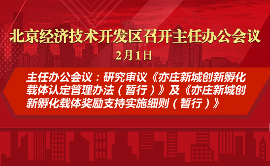 会议研究审议了《亦庄新城创新孵化载体认定管理办法(暂行)》及《亦庄新城创新孵化载体奖励支持实施细则(暂行)》。