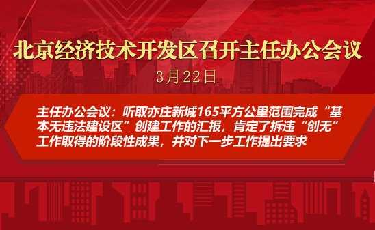 3月22日下午,管委会主任孔磊主持召开北京经开区2023年第8次主任办公会,研究审议优化提升工业用地市政基础设施、“基本无违法建设区”创建工作等事项。