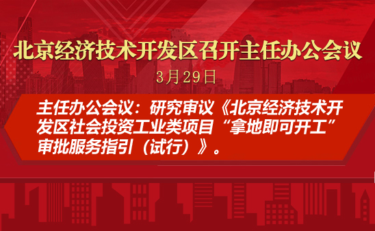 会议研究审议了《北京经济技术开发区社会投资工业类项目“拿地即可开工”审批服务指引(试行)》。会议指出,要提高认识,将“拿地即可开工”审批服务作为打造一流营商环境的重要举措持续优化完善,破解管理边界和制度执行难题,延扩服务适用范围,确保改革走在前列。要主动作为,梳理成功案例的服务流程、创新做法,同步出台相关文件,打造标准化、规范化、流程化的“拿地即可开工”审批服务模式。各产业专班要加强学习、主动调度,争取更多“拿地即开工”项目落地落实,全面推进项目快速落地、快速审批、快速开工。