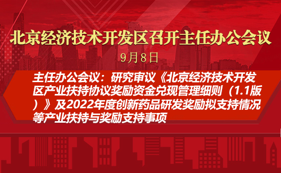 9月8日下午,工委副书记、管委会主任孔磊主持召开2023年第30次主任办公会,研究审议《北京经济技术开发区产业扶持协议奖励资金兑现管理细则(1.1版)》及2022年度创新药品研发奖励拟支持情况等产业扶持与奖励支持事项。