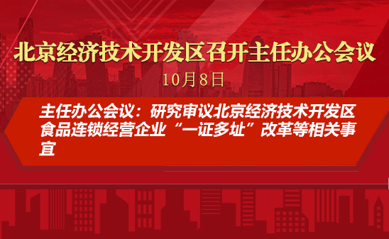 10月8日上午,工委副书记、管委会主任孔磊主持召开2023年第34次主任办公会,研究审议北京经济技术开发区食品连锁经营企业“一证多址”改革等相关事宜。亦庄控股总经理杨文良列席。