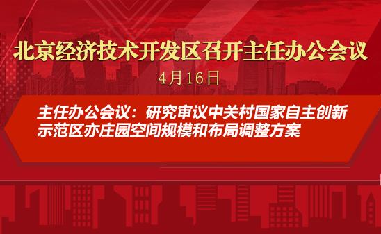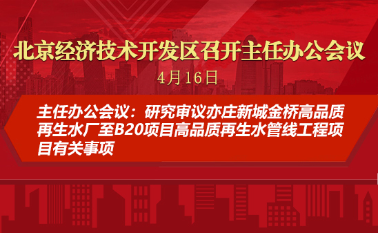 4月16日下午,工委副书记、管委会主任孔磊主持召开北京经开区2024年第15次主任办公会,研究审议高品质再生水厂管线项目、中关村国家自主创新示范区亦庄园空间规模和布局调整等相关事项。