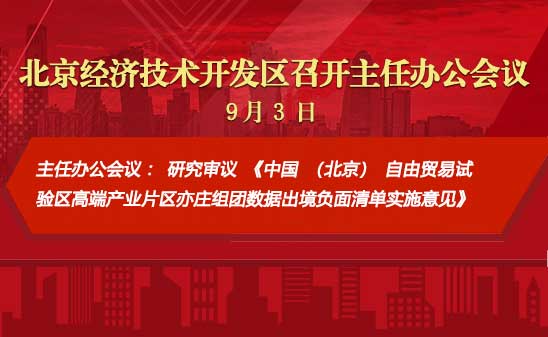 9月3日上午,工委副书记、管委会主任孔磊主持召开北京经开区2024年第33次主任办公会,研究审议《中国(北京)自由贸易试验区高端产业片区亦庄组团数据出境负面清单实施意见》(以下简称《负面清单实施意见》)和生物医药产业新项目落地相关事宜。亦庄控股总经理杨文良列席。