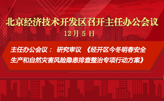 12月5日下午,工委副书记、管委会主任孔磊主持召开北京经开区2024年第42次主任办公会,研究经开区安全生产及自然灾害隐患排查治理、移动源协商减排和科文产业融合发展等相关事项。