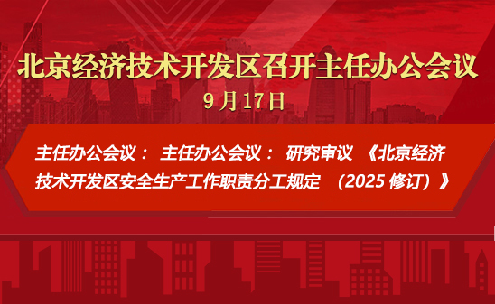工委副书记、管委会主任王磊近日主持召开北京经开区2025年第34次主任办公会,研究审议《北京经济技术开发区安全生产工作职责分工规定(2025修订)》《亦庄新城工业用地提质增效实施意见(试行)》等相关事项。